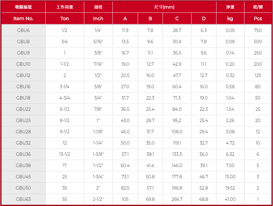 產品特性: 適用於直、側吊裝、多負荷的吊裝系統,拆卸方便載荷範圍:1/2Ton-55Ton本體材質:中碳鋼、鋅材質:碳鋼外觀:電鍍鋅安全係數:4:1